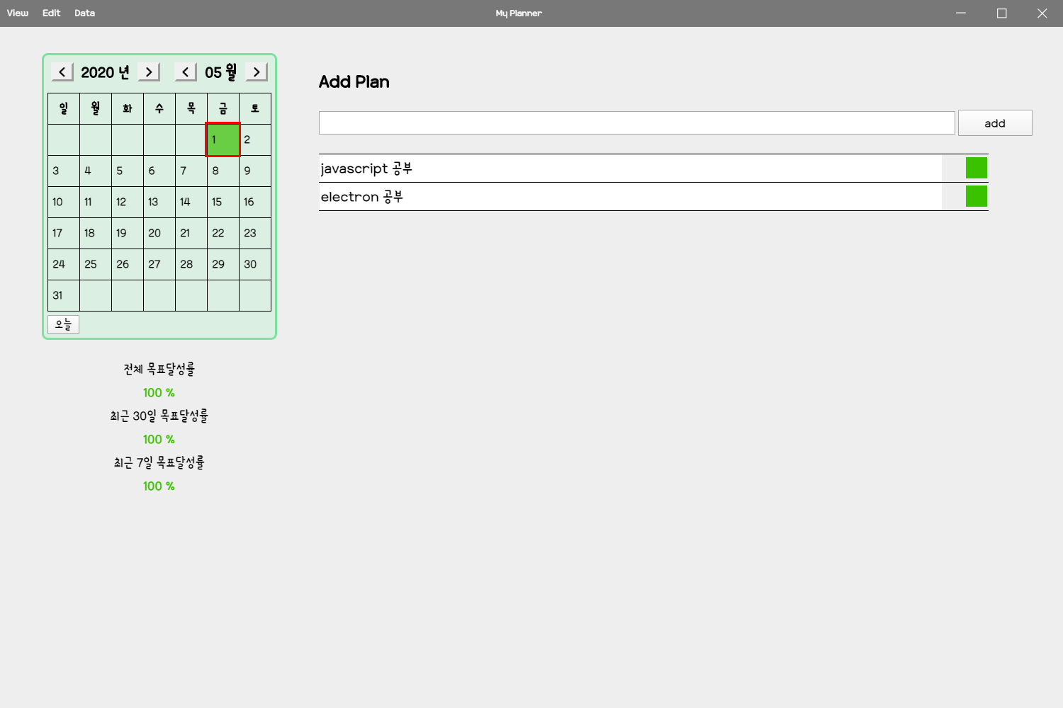 to do list를 만들어보고자 처음 시도했을 때에는 그저 바닐라 자바스크립트를 연습을 하는 것이 목적이었습니다. 하나의 프로젝트가 될 거라고 생각하지 않았죠. 하지만 일이 진행될수록 점점 불만이 생겼고 그것을 개선하고자 하는 욕구가 커졌죠. "할 일을 적는데 왜 날짜랑 시간이 없어?", "CRUD를 하는데 저장 데이터가 없어? node.js와 json을 써야겠네", "앱을 쓸 때마다 로컬 서버를 켜야 하나? 그냥 exe포맷의 데스크톱 앱으로 만들어보고 싶다." 그래서 자바스크립트로 데스크톱 앱을 만드는 방법을 찾아봤습니다. 노드 웹킷도 있고 다른 것들도 있지만 electron이 가장 많이 사용되는 것으로 보였고 참조할 자료가 많았기 때문에 electron을 사용해보기로 합니다.