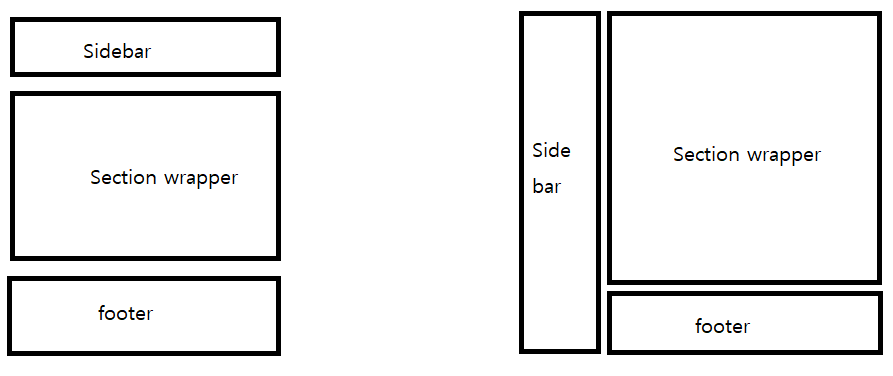 아래 그림과 같은 레이아웃이 있을 때 section wrapper의 부피는 대부분 웹의 경우 가변적입니다. 데이터가 그때그때 다를 것이기 때문입니다. 데이터가 정말 없을 때에는 section wrapper의 height값이 극도로 작을 수도 있습니다. 이럴 때에도 footer가 하단에 딱 고정되어 붙어있기를 원합니다.