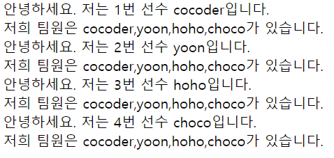 document.write('안녕하세요. 저는 ' + (i+1) + '번 선수 ' + cv +'입니다.<br>' +