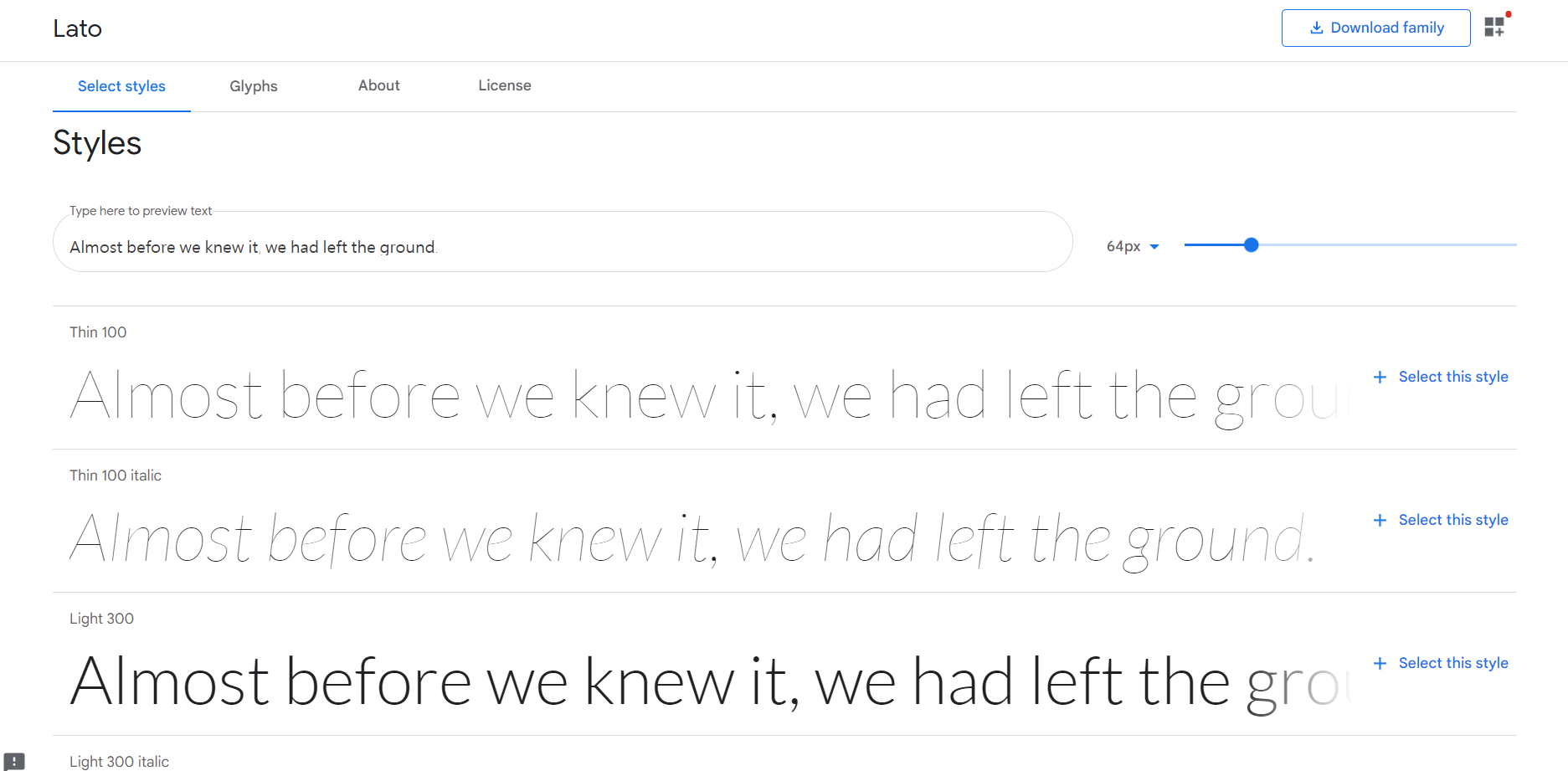 Thin 100, Thin100 italic 과 같이 쓰여있는 것은 CSS 코드상에서 font-weight와 font-style을 의미합니다. 이 폰트를 불러와서 적용한 후 CSS에서 font-weight 값을 100으로 주거나 font-style값을 italic으로 주는 경우 위에 표기된 것처럼 텍스트가 보이게 될 것입니다. 그런데 그전에 먼저 해당 스타일을 선택을 해줘야 합니다.