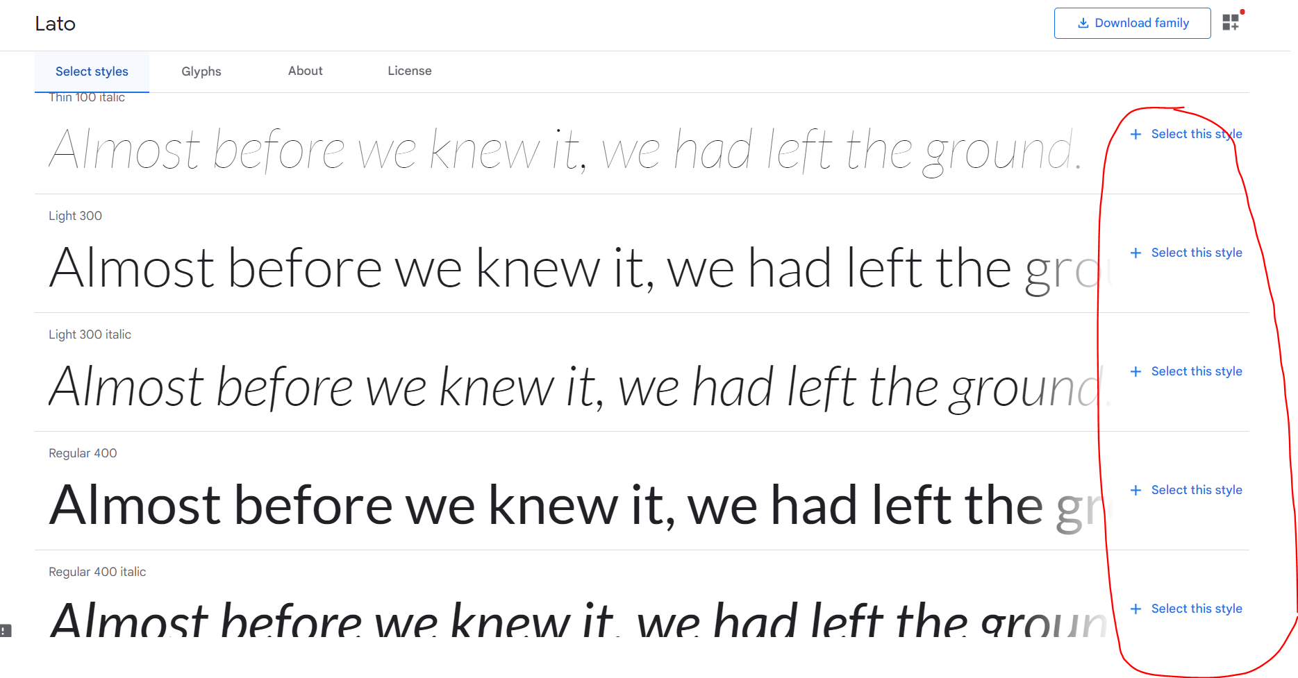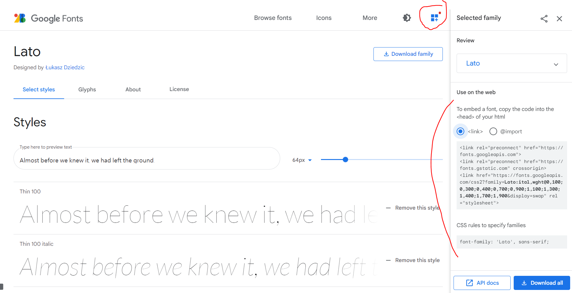 선택을 한 스타일만 import 해서 사용을 할 수 있습니다. 저는 모든 스타일을 다 선택하도록 하겠습니다. 그리고 페이지 상단에서 아래 이미지에서 동그라미표 한 아이콘을 클릭해줍니다. 그러면 오른쪽에 Selected family라고 쓰여있는 창이 뜰 것입니다.