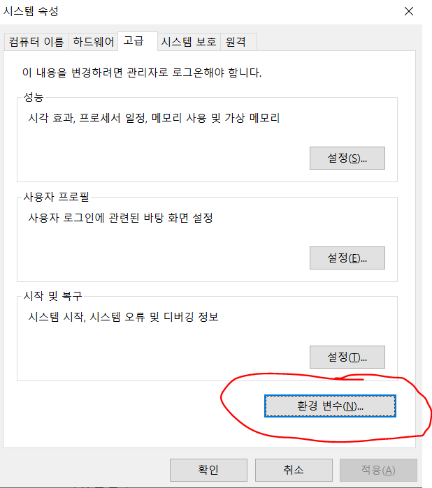 [고급] 탭에서 환경 변수를 클릭합니다.