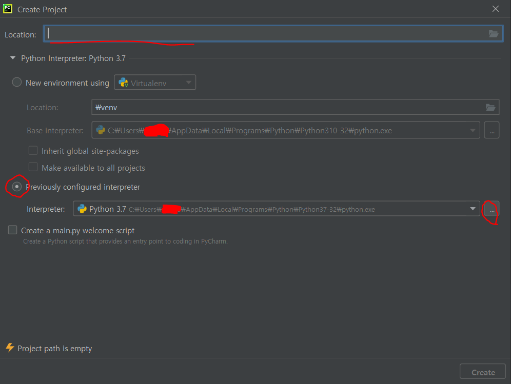 Location에는 새 프로젝트 디렉터리 경로를 적어주고, Previously configured interpreter에 체크를 한 후 ...을 눌러 conda 가상환경 인터프리터를 찾아줍니다.