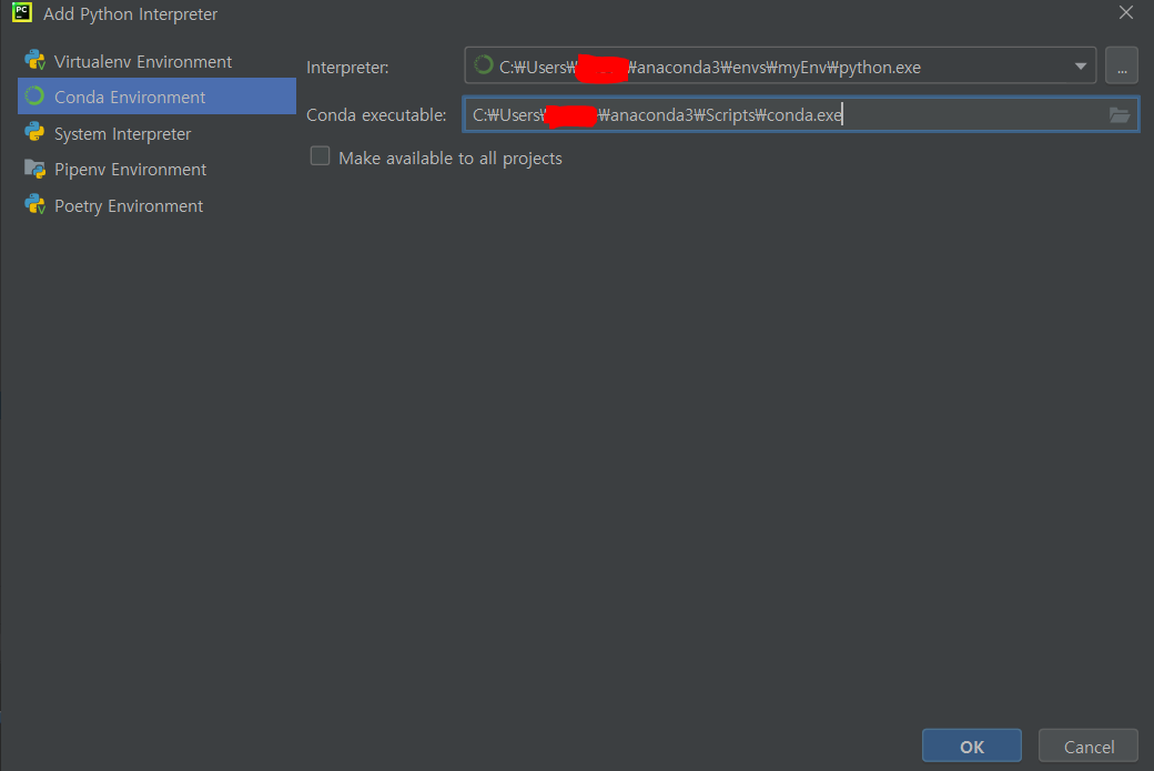 아나콘다가 설치된 경로에서 \envs\새가상환경명\python.exe를 Interpreter 경로로 잡아줍니다.