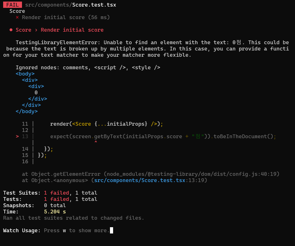 expect(screen.getByText(initialProps.score + "점")).toBeInTheDocument();