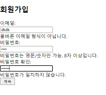잘못된 이메일 형식과 비밀번호를 입력하면 상황에 맞는 다른 에러 메시지가 나옵니다.