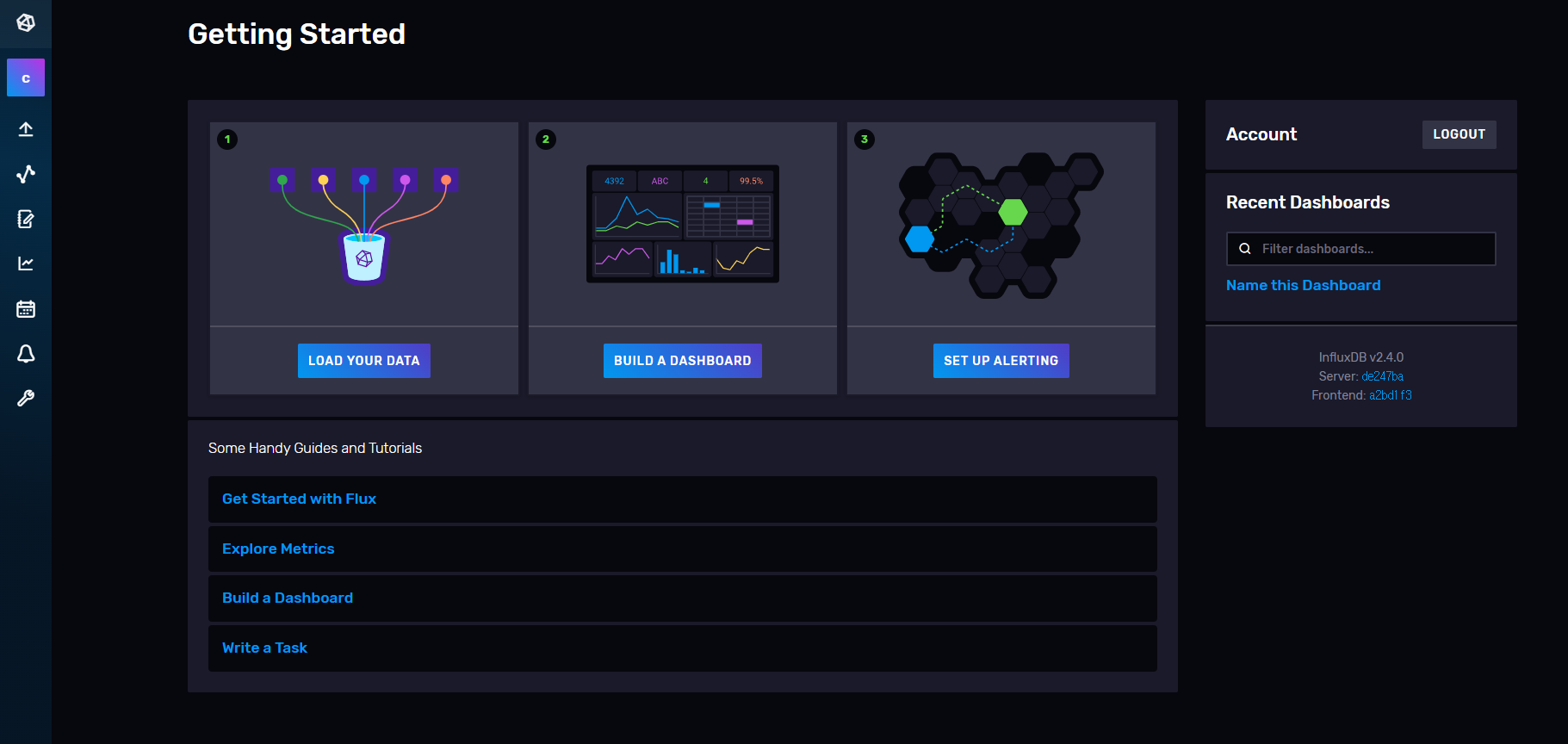 influxDB를 모니터링할 수 있는 툴은 웹으로 제공됩니다. localhost:8086에 접속하면 다음과 같이 생긴 웹페이지를 만날 수 있습니다.