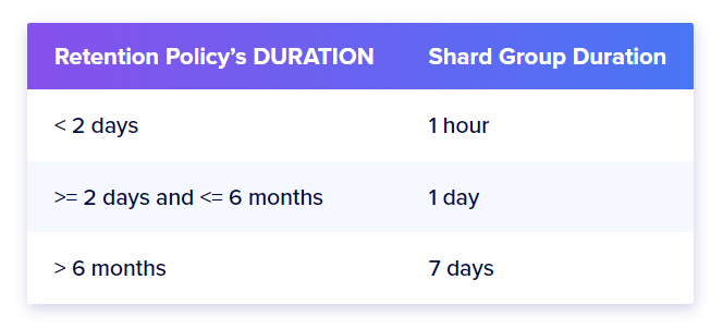아까 influxDB의 구조를 RDB에 비유하여 설명할 때, bucket을 database에 보존 기간 정책(retention policy)이 합쳐진 개념이라고 했는데, 이 보존 기간 정책은 shard group duration과 연결됩니다. 즉, bucket을 생성하면 shard group duration도 설정됩니다. 또한 retention policy를 변경하면 shard group duration도 변경됩니다.
