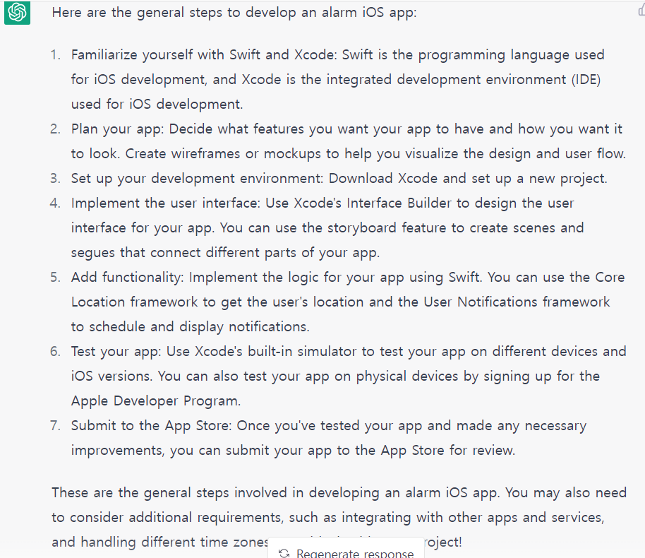 예를 들어 ios 알람 앱을 만들고 싶은데 어떤 순서로 해야 할지 물어봤습니다.